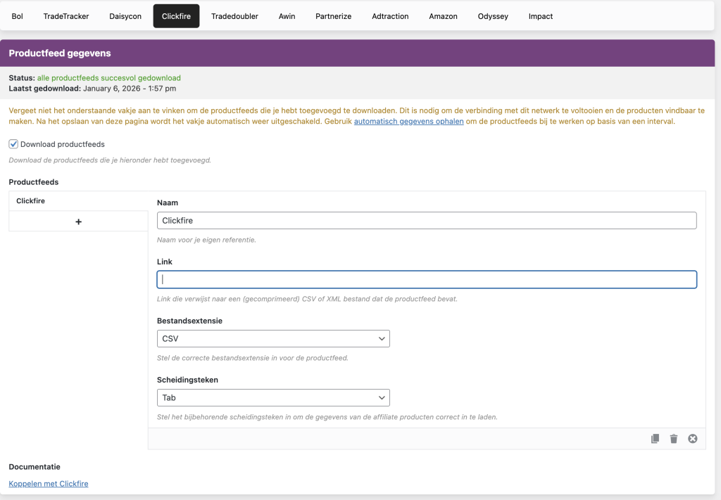 Ga naar Affiliate Held – API-instellingen in het WordPress menu. Kies voor de tab “Clickfire”