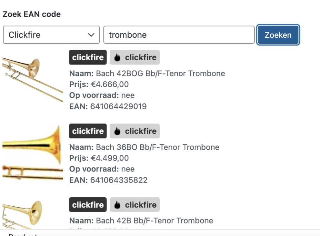 Om te testen of de koppeling juist werk, zoek je een product uit de feed op via Affiliate Producten – Nieuw product toevoegen in het menu. Kies voor Clickfire. Zoek een product uit de feed zoals in onderstaand voorbeeld. Er verschijnen nu producten waarvoor je ook andere aanbieders kan ophalen (als die er zijn).